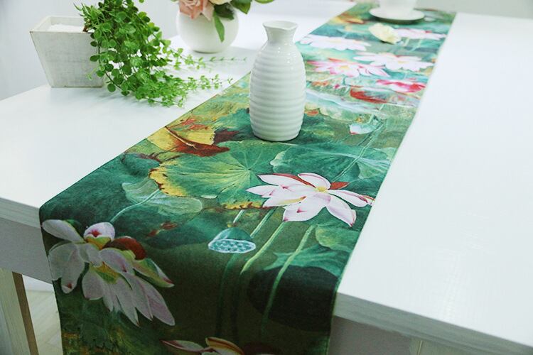 現代のテーブルランナー蓮プリントウェディングホテル宴会パーティーホーム高級プリントコットンリネンダイニングルームのテーブルランナー装飾