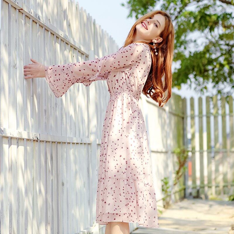 女性甘いピンクの花柄シフォンドレス秋 2018 新ファッション弓ノットフレアスリーブ弾性ウエスト女性ののロングドレス