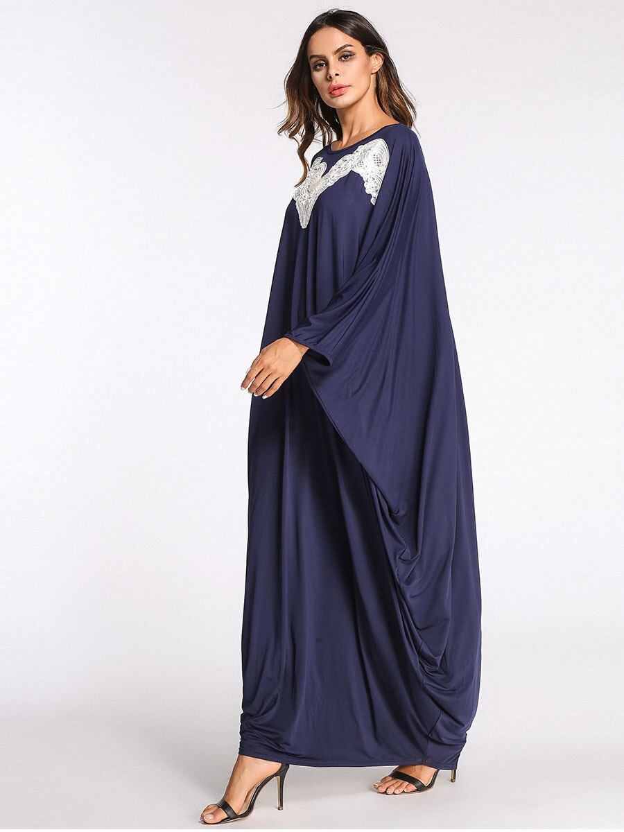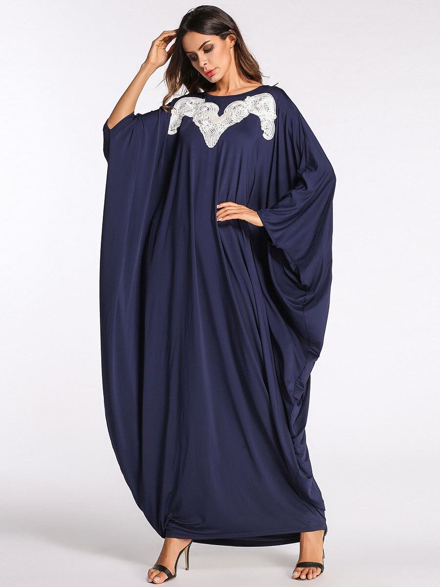 女性イスラム教徒のドレス O ネックロングバットウィングスリーブネイビーブループラスサイズイスラム服アップリケ中東トルコドバイアバヤ