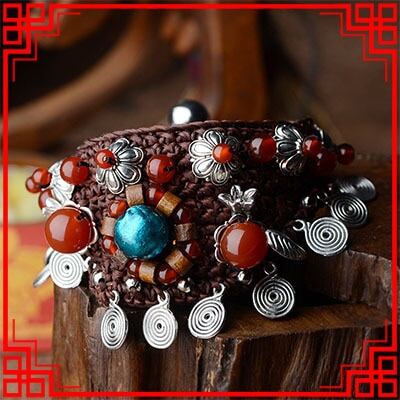 手作り編組石ブレスレット、新しい高級エスニックタイミャオ族シルバーブレスレット、ファッション高級ヴィンテージガラス張りガラスブレスレット、