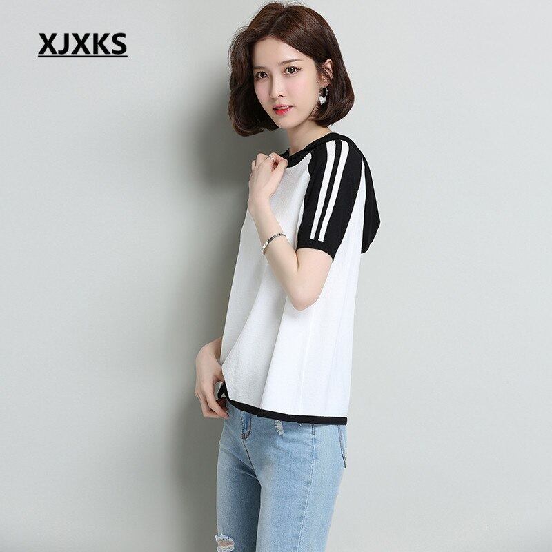 Xjxks 2018新しい女性の夏のtシャツファッションフード付き半袖快適なカジュアル通気性リネンストライプ女性のtシャツ