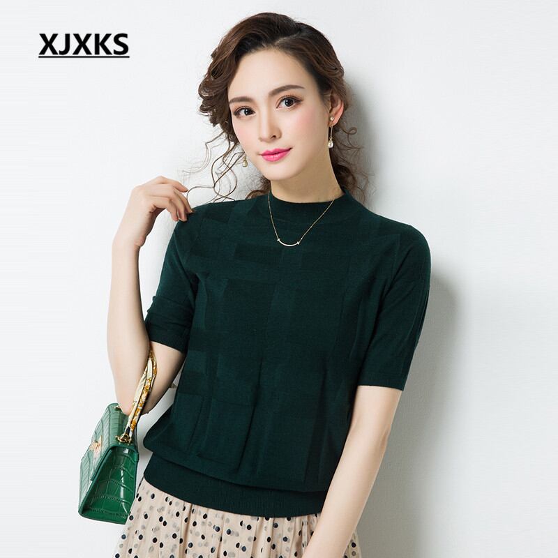 Xjxks女性の夏のtシャツ2018新しいファッションニットウール薄いネック半袖快適な野生の女性トップとtシャツ