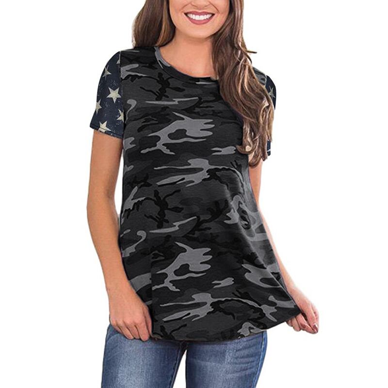 夏の Tシャツ女性半袖迷彩スターパッチワークトップスカジュアル O ネックトップス Tシャツ tシャツブランド服 6Q1808
