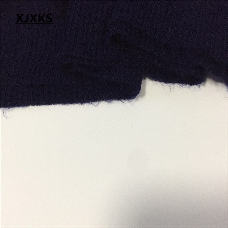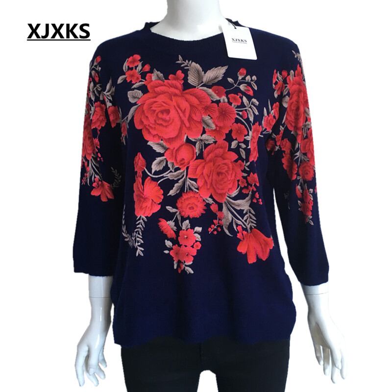 Xjxks女性のプリント薄いニットセーター春秋プルオーバーラウンドネック膝スリーブ女性シャツトップス