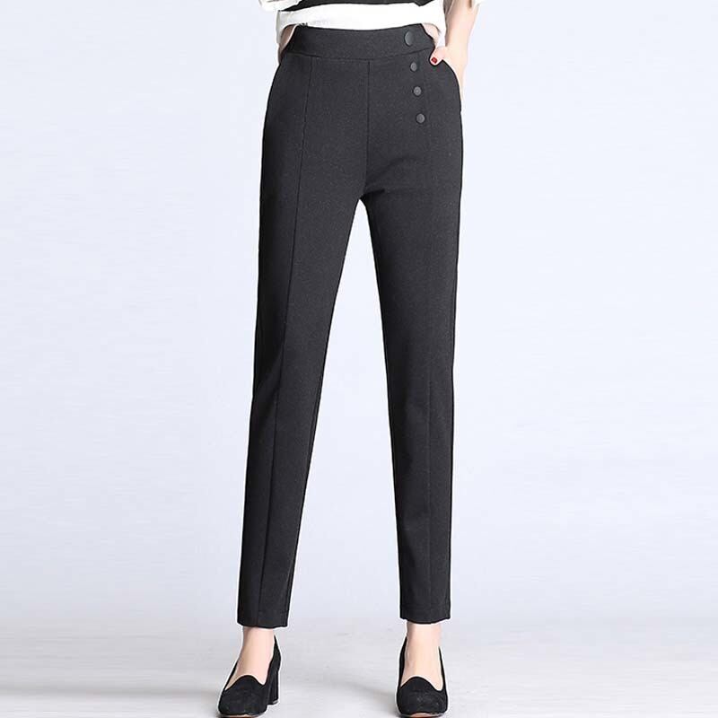 熱い販売2018女性クラシック高弾性ウエストハーレムパンツ女性ファッションスリム無地ボタン足首の長さ鉛筆パンツ