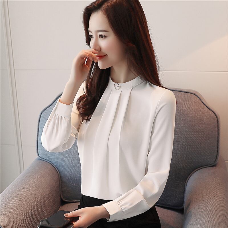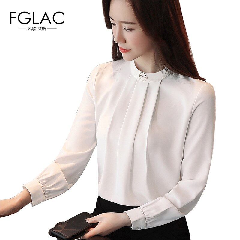 Fglac女性シフォンブラウスロングスリーブホワイト女性シャツエレガントスリムスタンド襟オフィス女性ブラウスプラスサイズの女性トップス