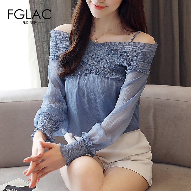 FGLAC 秋ブラウスシャツファッションカジュアル長袖女性ブラウスエレガントなスリムセクシーなスラッシュネック女性シフォンシャツ blusas