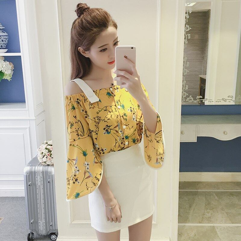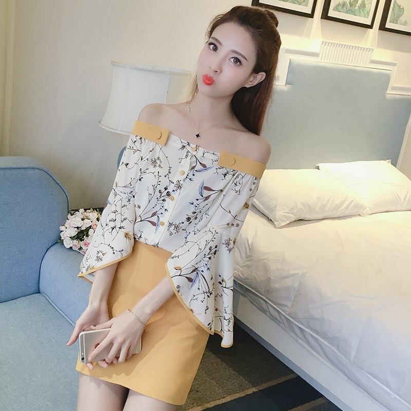 を女性ブラウススリムスカート服セット2017夏新デザインスカートスーツ露肩花シフォンツーピースの服韓国styl