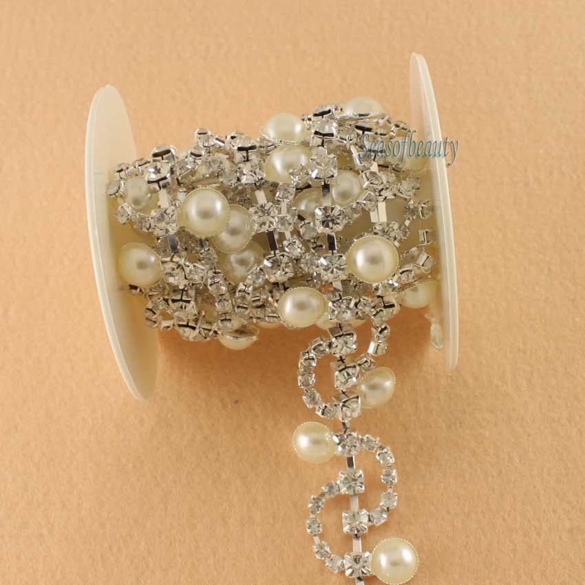 1ヤード2.5センチベージュパール透明ラインストーン銀メッキアップリケブライダルサッシクリスタルホットフィックス縫製トリムR2158