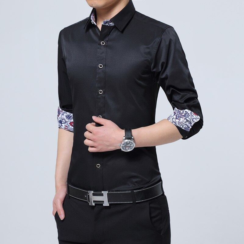 2018 新ファッションブランドの服メンズシャツカジュアルスリムフィット韓国固体スクエアコロール白長袖シャツのため男性 M-4XL