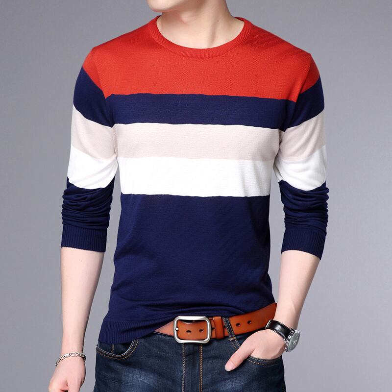 2018 新秋冬ファッションブランド服プルオーバーメンズセーター O ネックストライプスリムフィット通気性男性用セーター