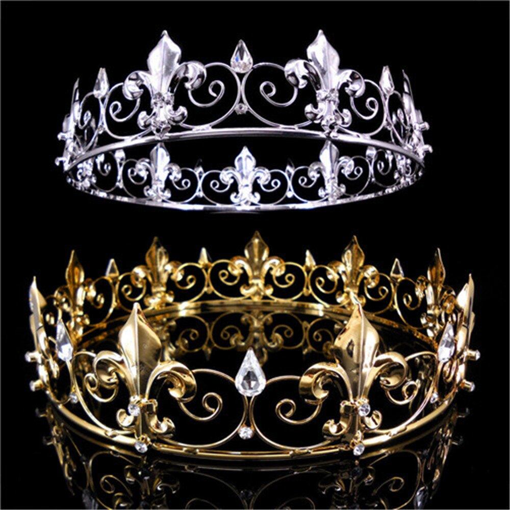 男性の帝国中世ウエディング新郎王の王冠の頭の装飾品ヴィンテージフルラウンドシルバー/ゴールドラインストーン王冠花嫁の結婚式ティアラ
