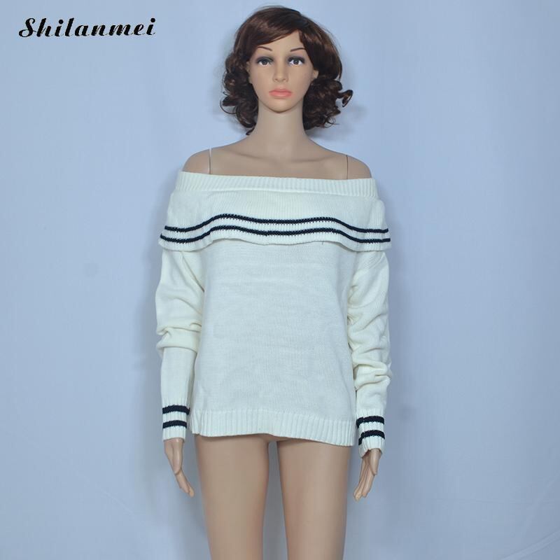 ストライプオフショルダー女性セーター 2018 秋冬長袖レディースセクシーなプルオーバーカジュアルルーズニットセータープルファム