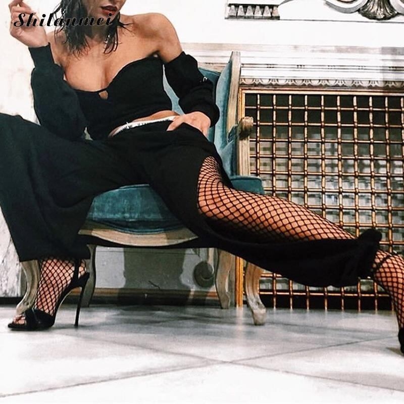 女性中空アウト夏の女性のパンツ弾性ハイウエストカジュアルルーズロングズボン固体黒ナイトクラブハーレムパンツストリート