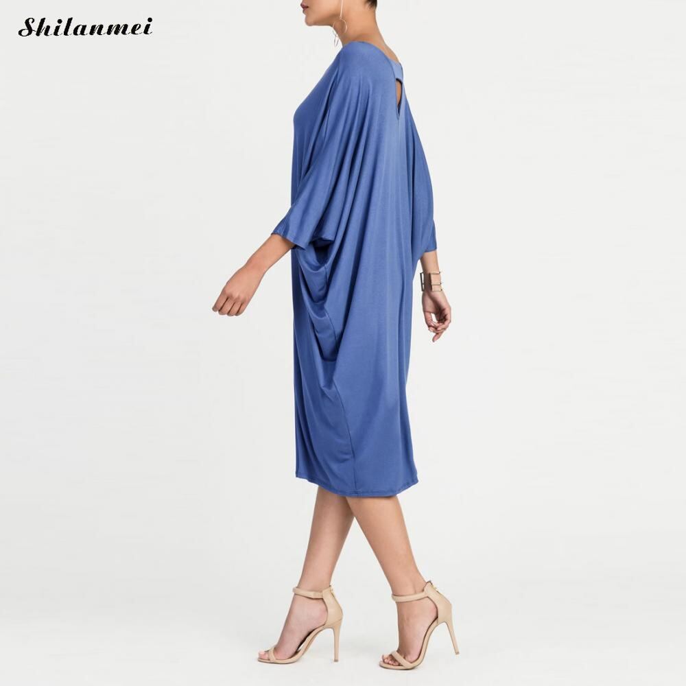 2017秋の女性vネックバットウィングスリーブ固体背中が大きく開いミディドレス因果緩いol仕事カフタンだぶだぶのエレガントなパーティードレスvestidos