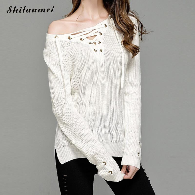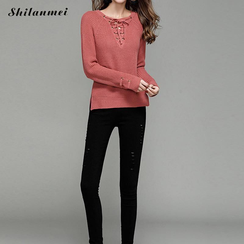 レースアップニット冬のセーター女性ルース白プルオーバー弾性ウエスト秋冬カジュアル長袖生き抜く2017ストリート