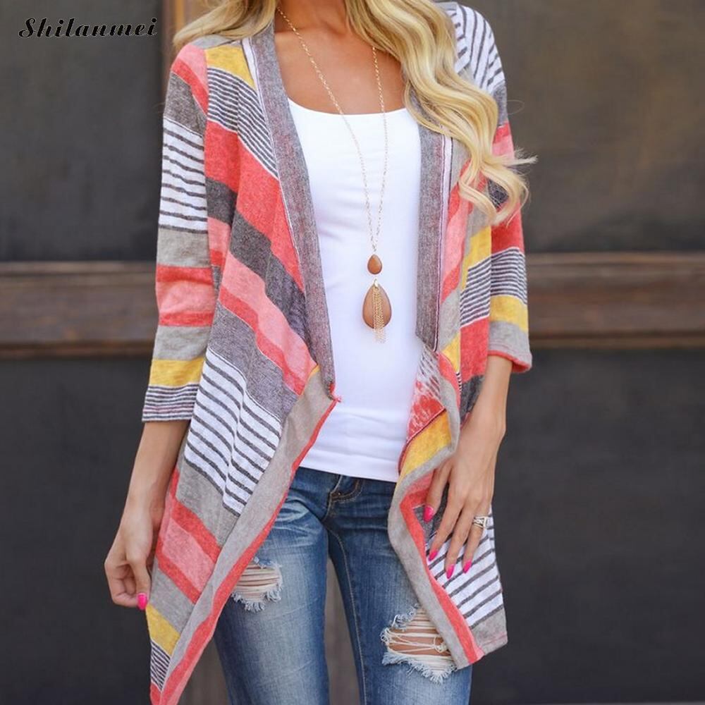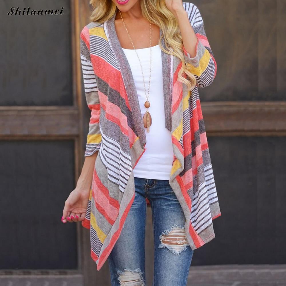 ロングスリーブストライプのトップス女性カーディガン2017トレンディ女性非対称オープンステッチニットセーターカジュアルカーディガンセーター