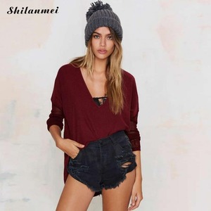 2017女性中空アウトセクシーなvネックニットセータープルオーバー緩いトリコットカジュアル綿生き抜くジャンパーセーターmujer blusas
