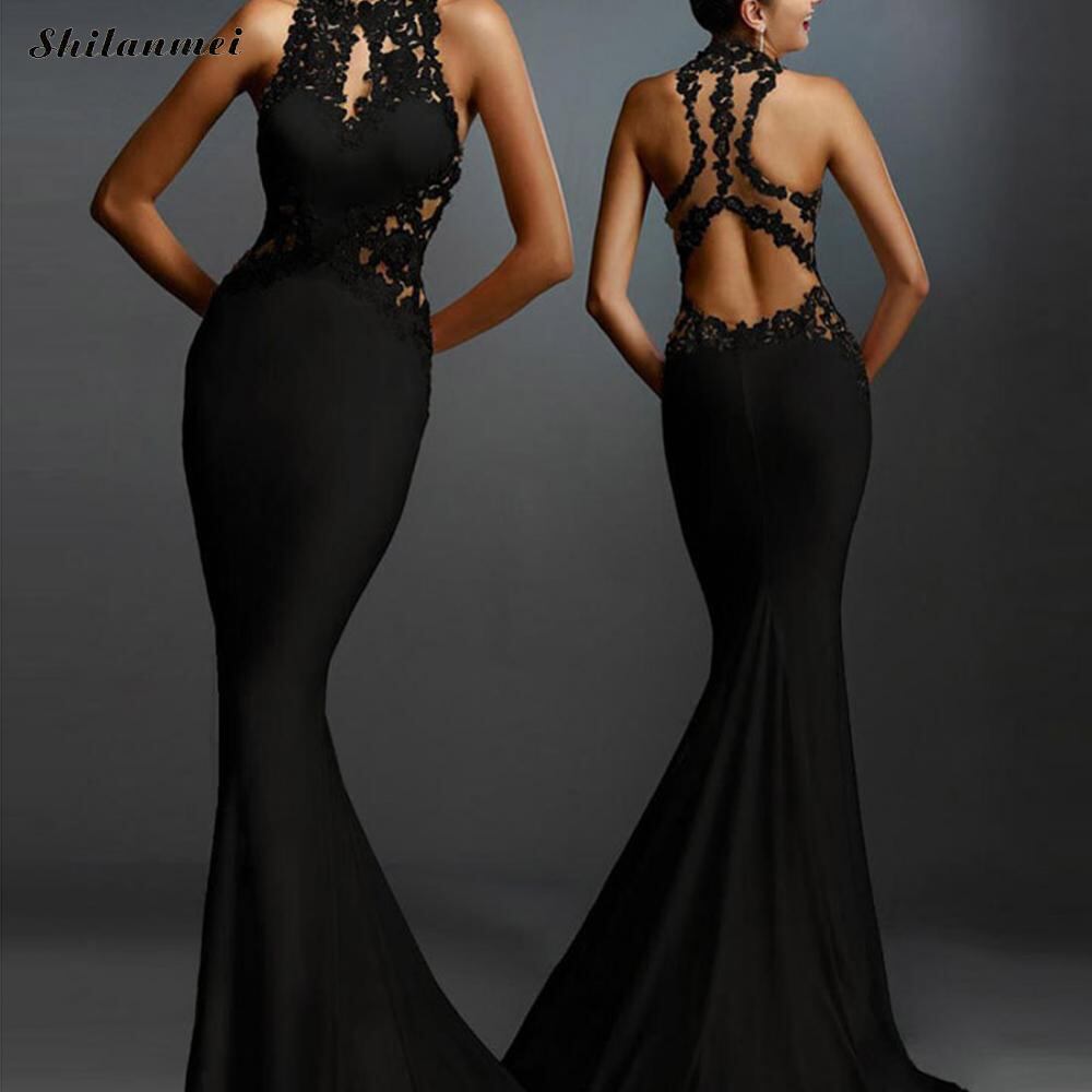 エレガントなblakホワイトロングパーティードレスvestidosマーメイドマキシembroideriedレースドレスセクシーな背中の開いたオフショルダーホルタークラブ着用