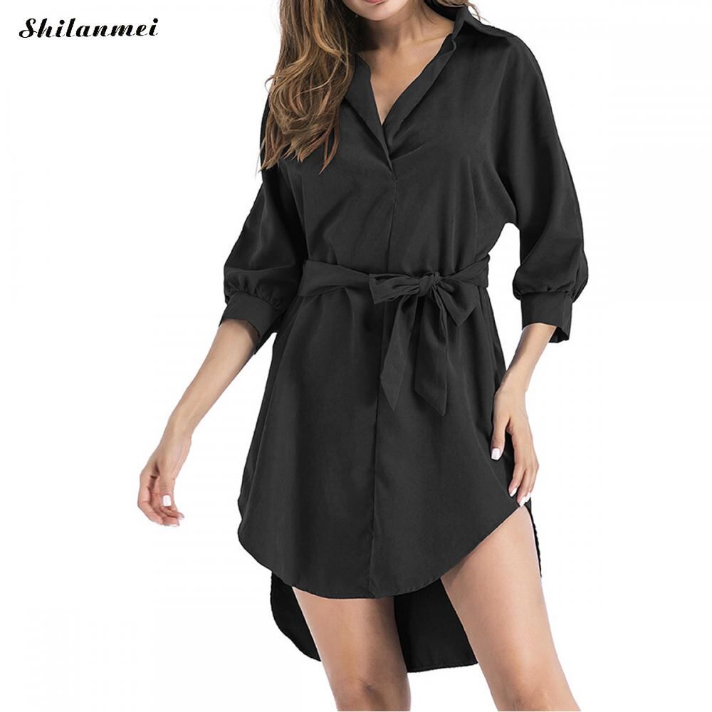 ファッション秋の女性のシャツドレスカジュアル不規則なショートドレスベルトターンダウン襟 3/4 袖ヴィンテージセクシーなミニシフトドレス