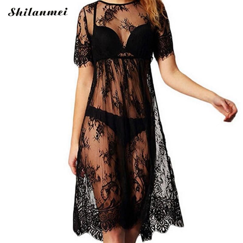 女性のレースのドレスカジュアルロングブラックホワイトショートスリーブoネックシースルーのセクシーなビーチウェア女性mnidi夏ドレス
