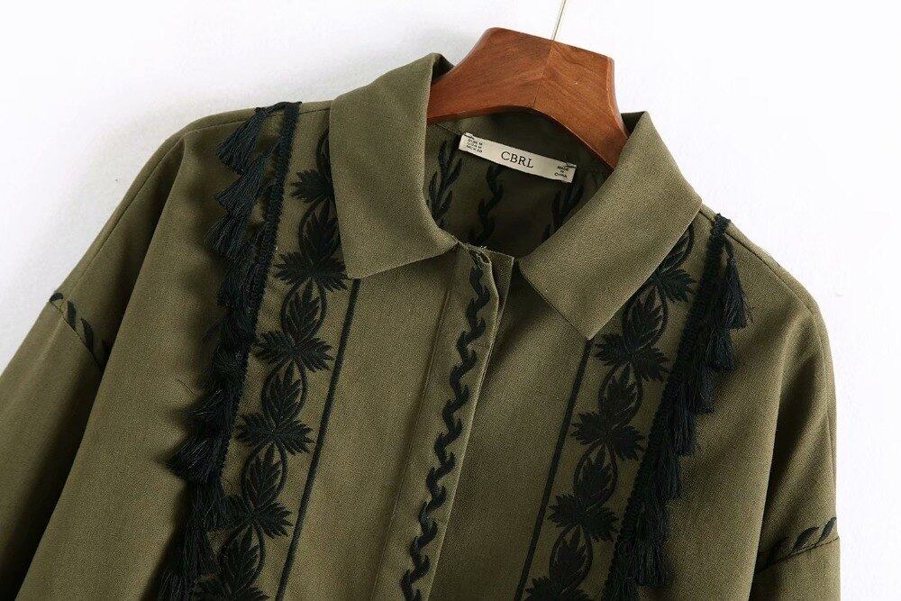 2018 秋の新入荷ヴィンテージアーミーグリーンジャケット、ブランドデザイナーファッションプリーツスカートコートタッセル