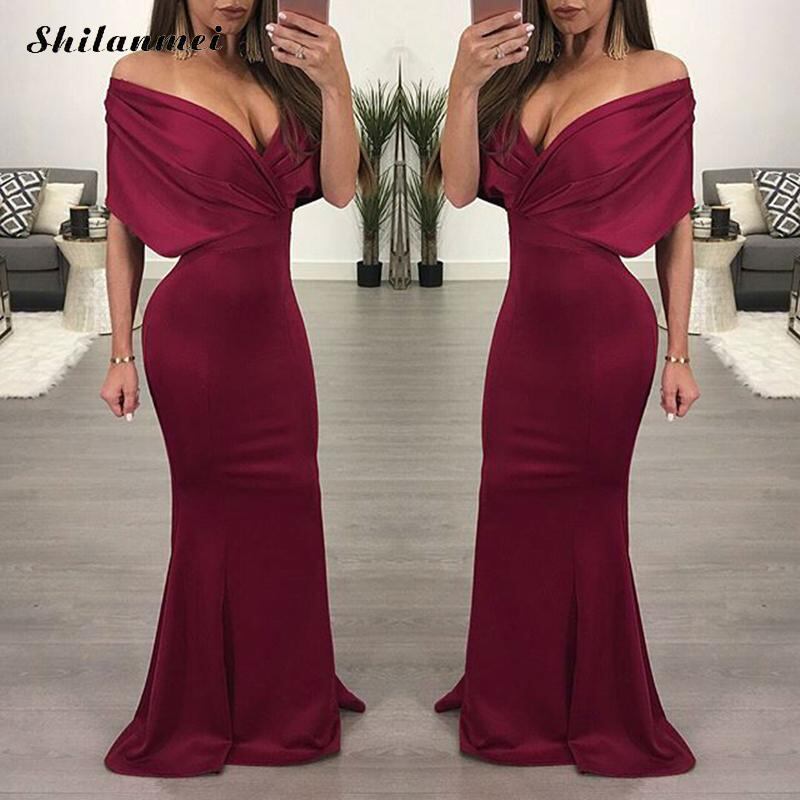 エレガントなレッドマーメイドパーティードレス女性のための 2018 ローブセクシーなディープ V ネック床長さのドレスを肩クラブ結婚式の摩耗