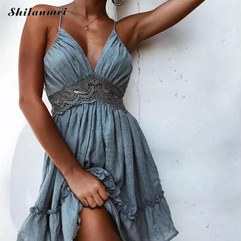 深いv背中が大きく開い女性のドレスセクシーなスパゲッティストラップパッチワークレースドレス2018セクシーな女性vネックノースリーブビーチドレスvestidos