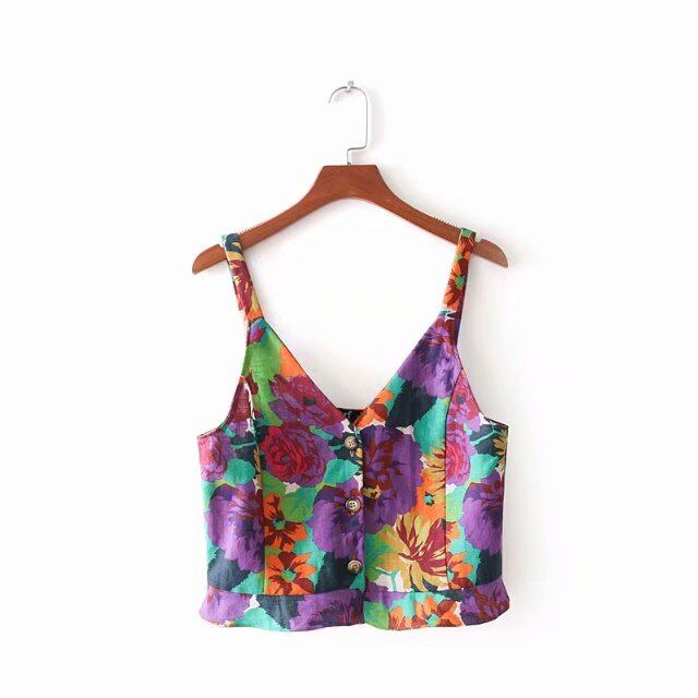ヨーロッパ新しいスタイル2018女性のファッションフローラルプリントショートキャミソール、セクシーなカジュアルリネンキャミソールエレガントスリムカラートップス
