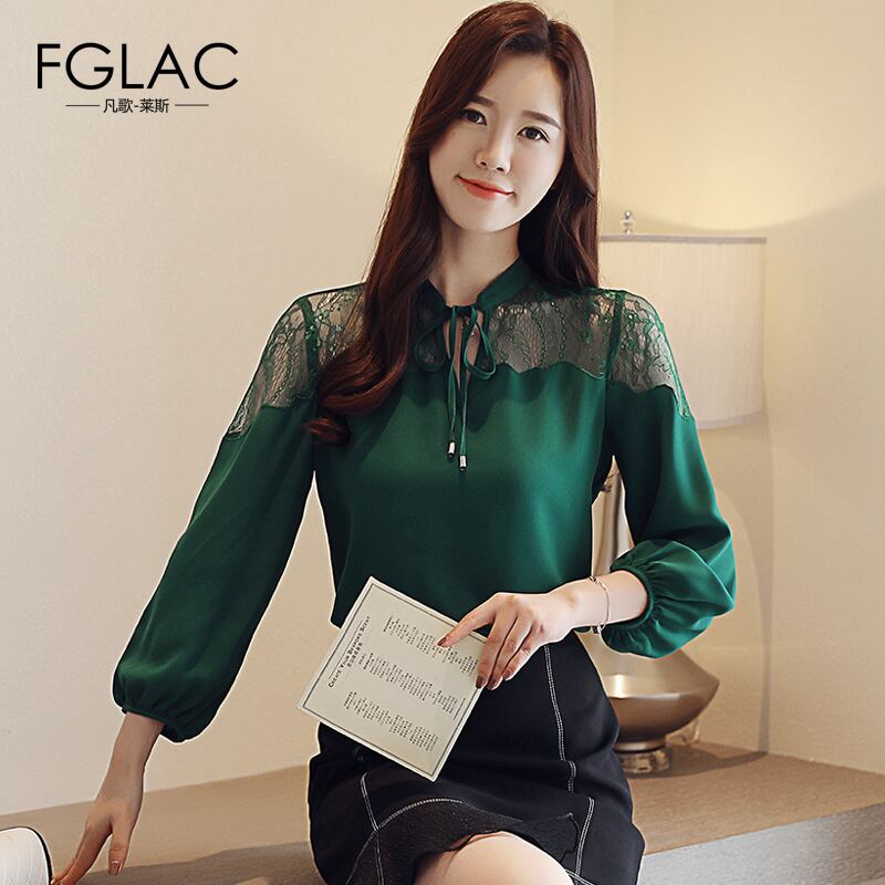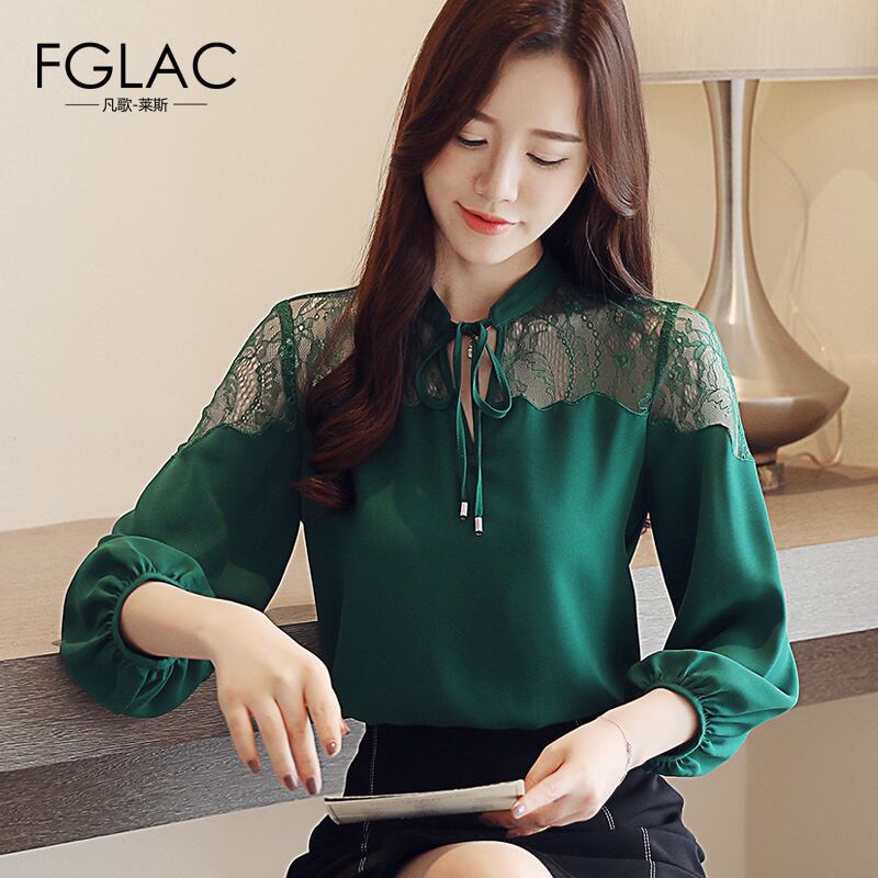 FGLAC 女性ブラウスシャツ新ファッションカジュアルセクシーなアウト中空レースのシャツエレガントなスリムパッチワークシフォンブラウスグリーントップス女性