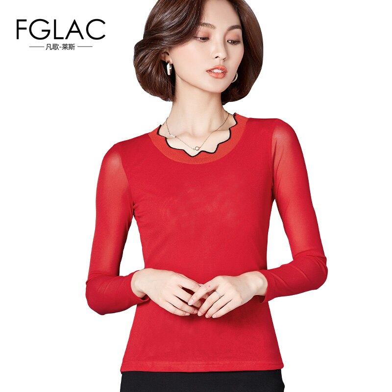 Fglac女性tシャツファッションカジュアル長袖oネックメッシュトップスエレガントスリム秋tシャツプラスサイズの女性服