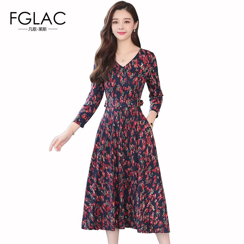 FGLAC 女性ドレス新ファッションカジュアル 3 分袖プリント秋のドレスエレガントなスリム V ネックヴィンテージ vestidos パーティードレス