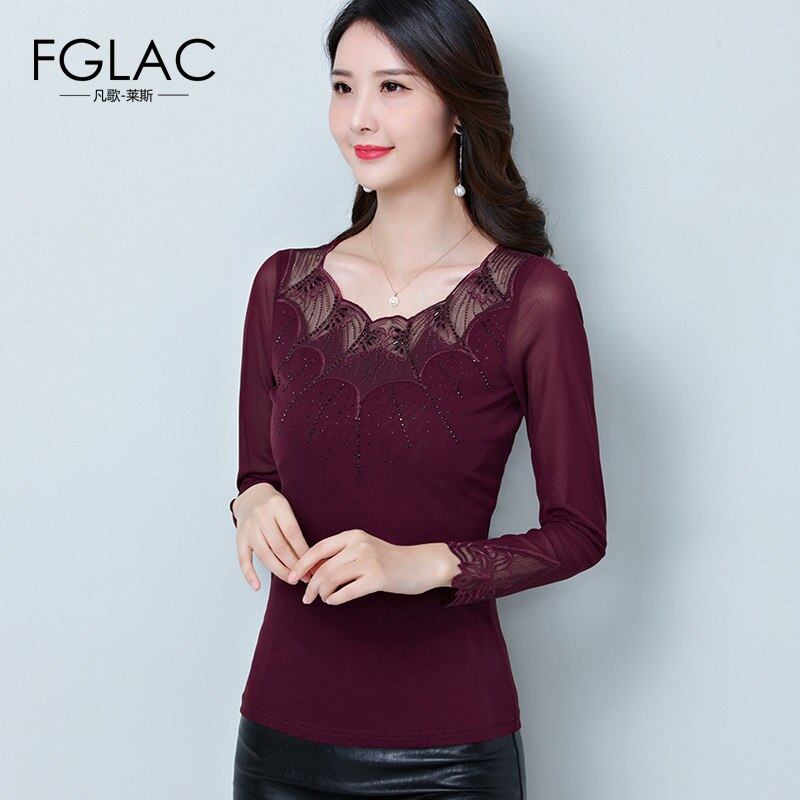 FGLAC 女性ブラウスシャツエレガントなスリム中空アウトメッシュトップスファッションカジュアル長袖ダイヤモンド女性トップス