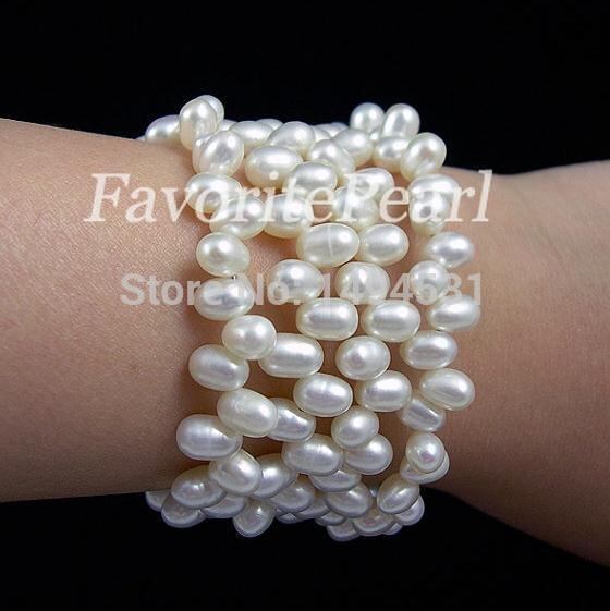 結婚式の パール ジュエリー-トリプル行7-8 インチ ホワイトカラー ナチュラル淡水パール ラップ ブレスレット-送料無料