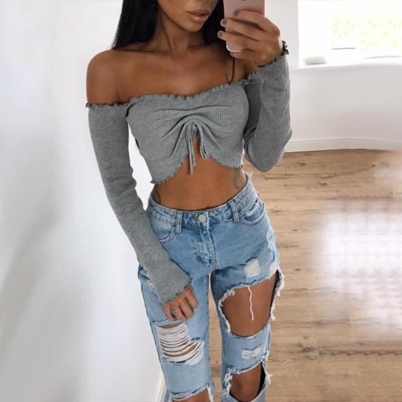 Aescondoセクシーなスラッシュネックオフショルダーストレッチtシャツ女性新2018春のファッション長袖ショートクロップtシャツトップス