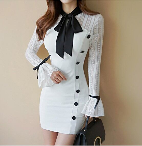 女性ドレス 2018 韓国スタイル白黒パッチワークレースのドレス蝶ネクタイ中空アウトかわいいセクシーなミニドレス