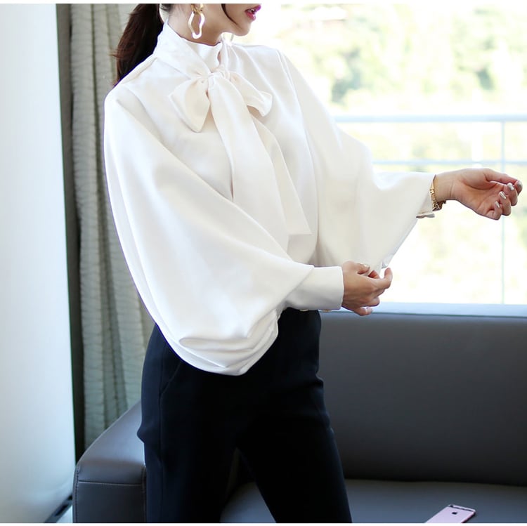 春秋の女性ブラウス韓国 2018 オフィスレディホワイトシフォンロングランタンスリーブボウシャツカジュアルルーススタンドカラーブラウス