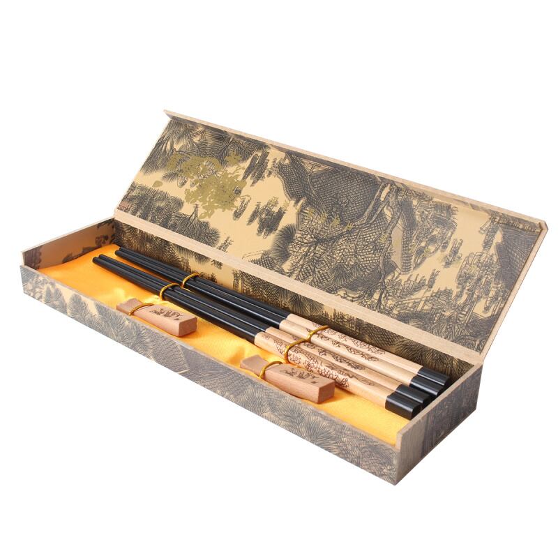 2 pairs中国スタイルウッド木製箸ホルダーとボックス中国箸ホームキッチンダイニング食器結婚祝い