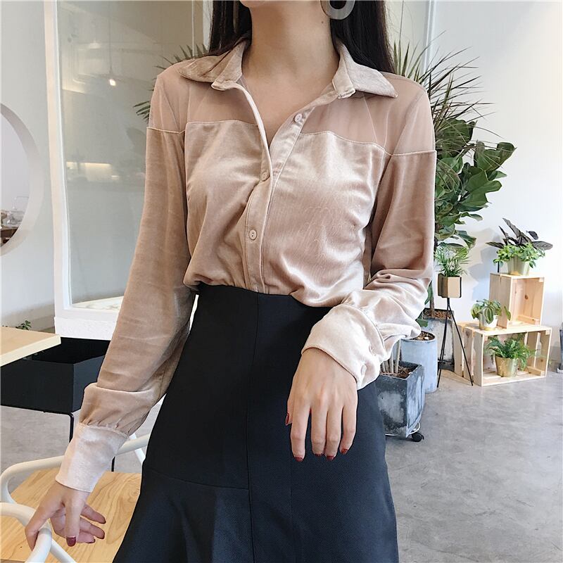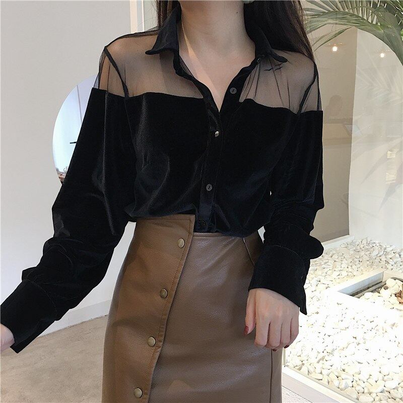 透明セクシーな黒ブラウス女性ベルベット長袖春秋メッシュ正式なシャツ作業服エレガントなトップス1068