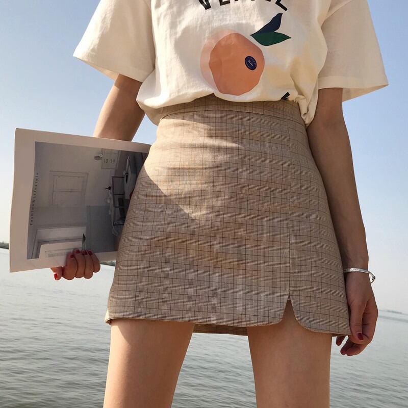 春秋不規則なスカート女性ヴィンテージハイウエストチェック柄スリットスカートすべてが一致したミニ saias ファム 1233