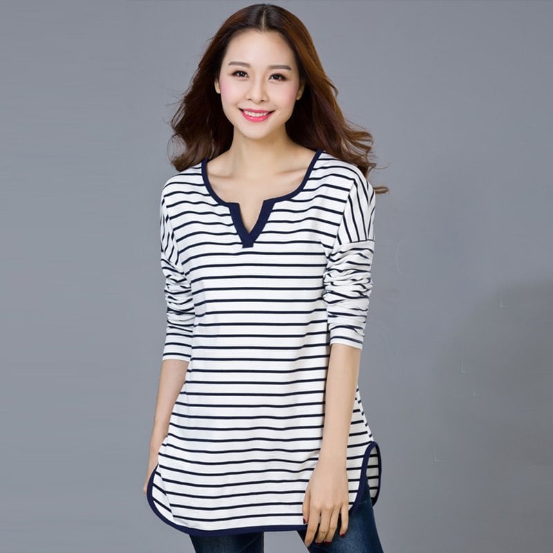 M-4xl新しい縞模様の長袖tシャツ女性の綿緩いtシャツ大サイズ長いセクションカジュアルなトップス0577
