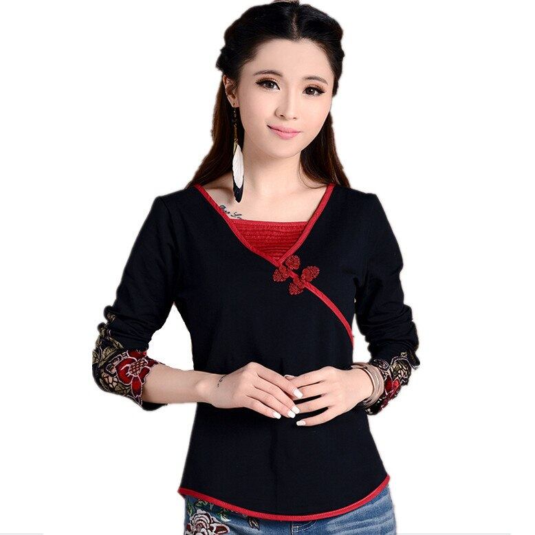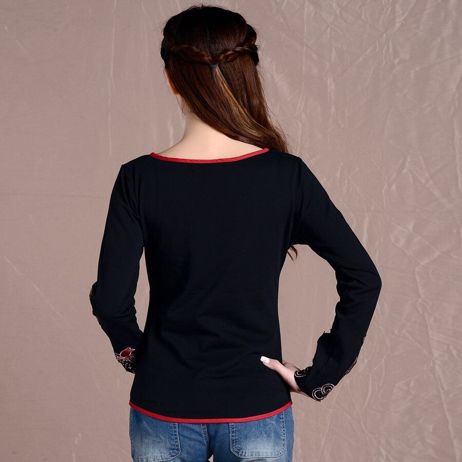 ヴィ ンテ ージ ロング スリーブ v ネック黒刺繍カエル ボタン tシャツ用女性春冬エスニック コットン tシャツ tシャツ トップ 0561