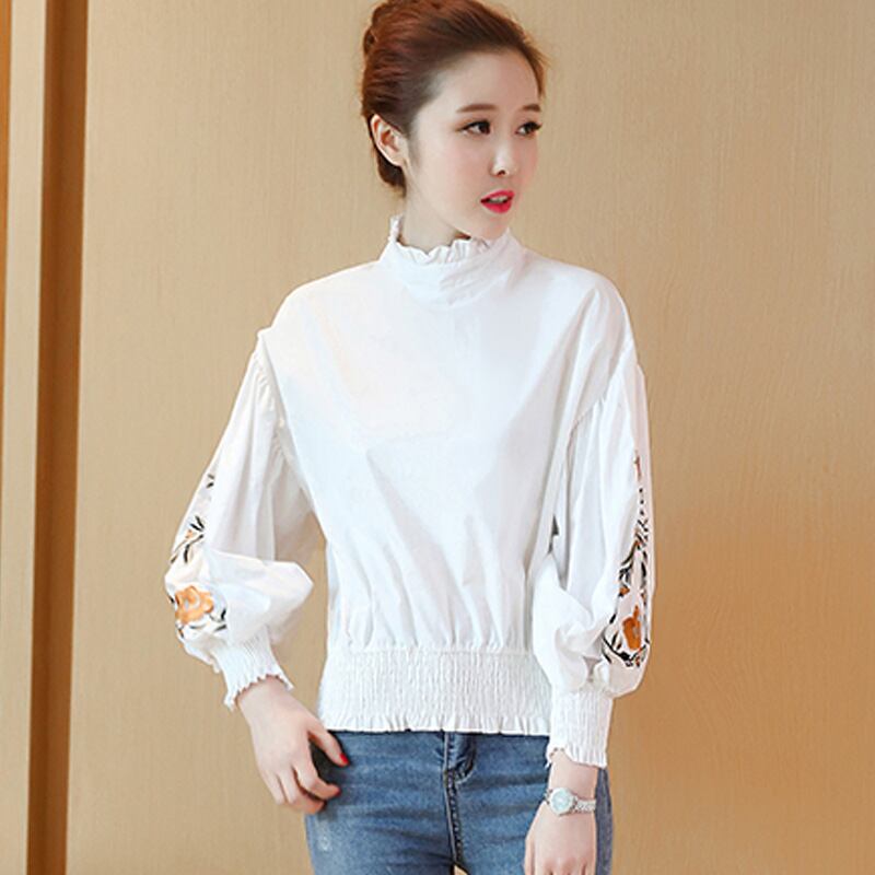 ヴィンテージ女性ブラウス花刺繍シャーリング裾トップスランタンスリーブclothing 2017エレガントな高ネックブラウス0868
