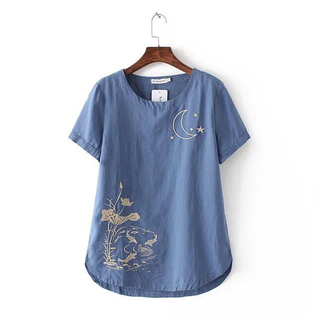 新しい到着夏トップス緩い蓮池月光コットンリネン刺繍半袖シャツ女性blusa feminina 1140