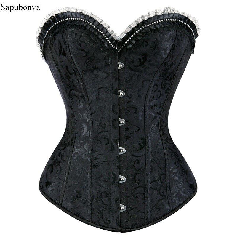 Sapubonva黒ゴシックビスチェコルセットトップブライダルラインストーンホワイトコルセットoverbustストラップレス錦織コルセットレースアップシェイパーファム