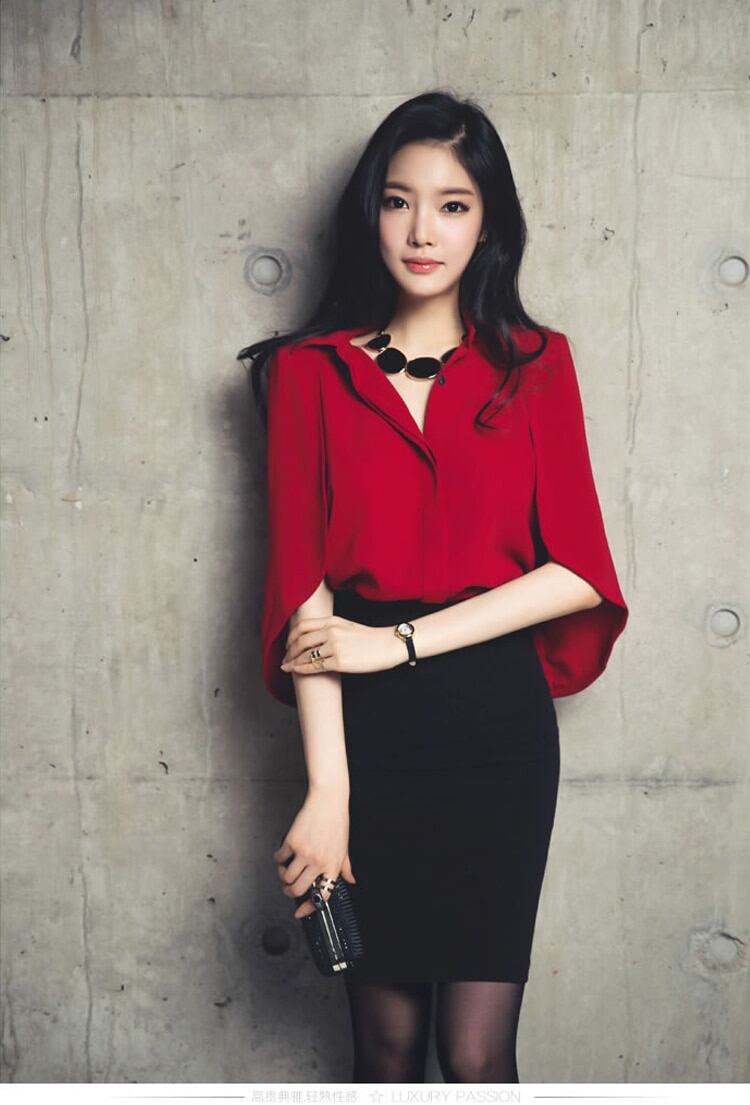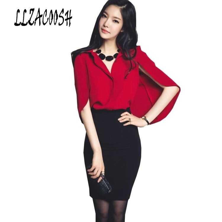 2ピースセット女性スーツ2018夏オフィス赤いマントシフォンブラウスシャツトップスとブラックペンシルミニスカートクロップトップとスカート