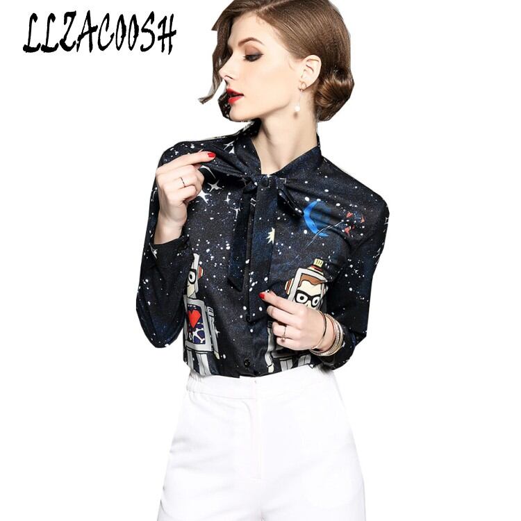 ロングスリーブオフィス女性ブラウス2018ファッションレースアップ弓ネクタイスター漫画プリント女性シフォンブラウスolワークレディーストップス