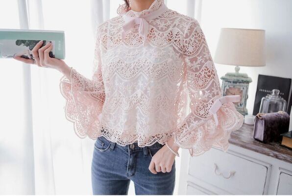 2018新しいピンクのセクシーな中空アウトフレアスリーブ花刺繍かぎ針編み女性レーストップシャツblusas