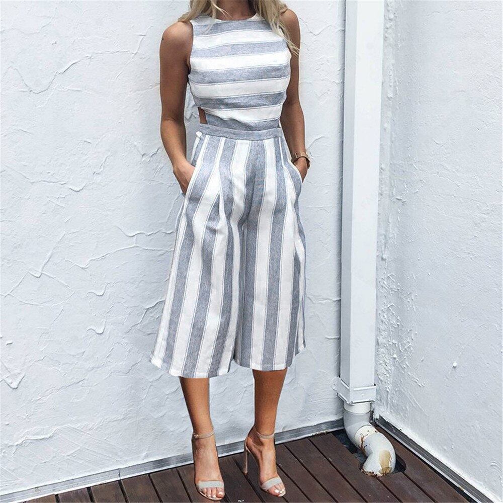 エレガントなレディースワイド脚ジャンプスーツ夏カジュアルノースリーブストライプスーツ緩いズボン女性ロンパース夏ストライプジャンプスーツ