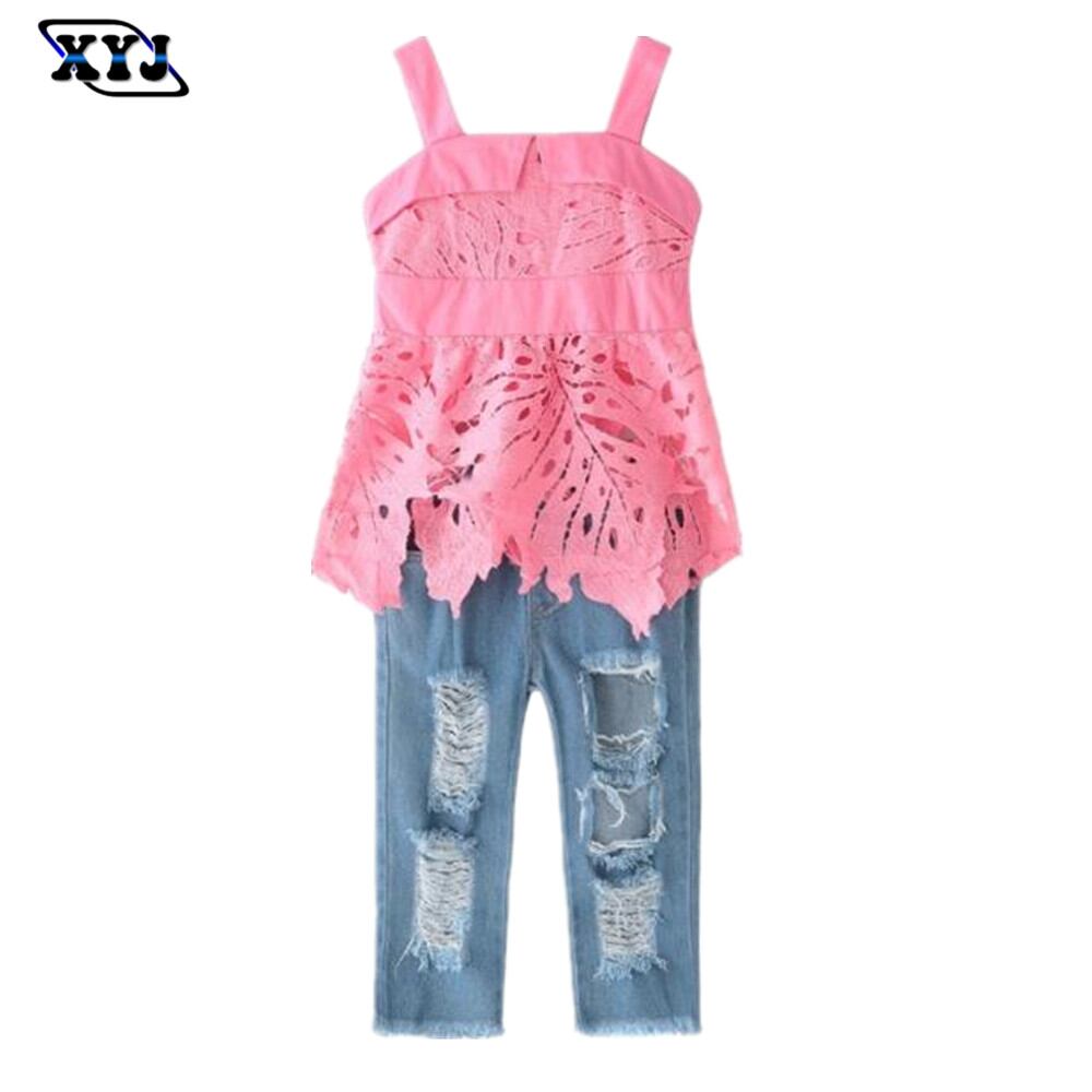 2018 夏の服セットピンクのためのベスト + ブルージーンズスーツパンツスーツ 2 Peice スーツのためのベビー少女の服